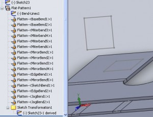 The other option noted is the Sketch transformation. This will appear as a folder at the end of the Flatten feature tree ONLY if there is a sketch that must be transformed AND the part is currently flattened. Solidworks will use any sketch not linked to a feature. The original sketch if shown will still appear floating in air (as seen in the picture). The transformed sketch can be used in drawings of the flat pattern.